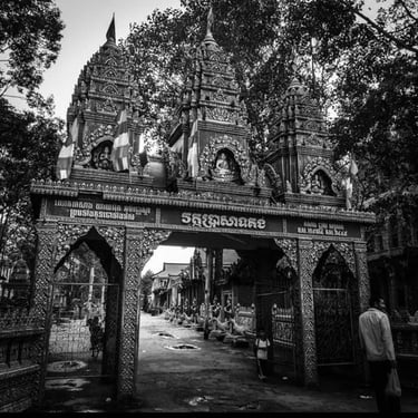 The architecture here doesn't whisper. It announces itself. Those stupa towers rise sharp and unapologetic, drawing a direct line back to Angkor Wat. Through my viewfinder, the contrast hit me every time: the chaotic, motor-scooter chaos of a Vietnamese street crashing up against the serene, timeless geometry of a Khmer sanctuary. Two worlds occupying the same space, neither one willing to budge.